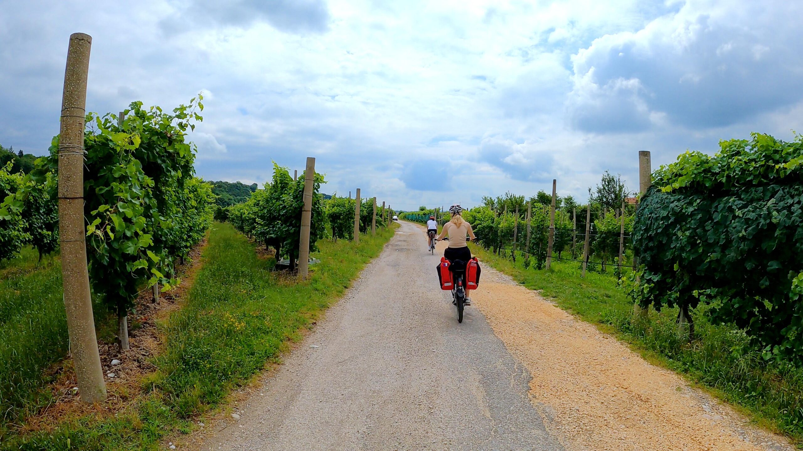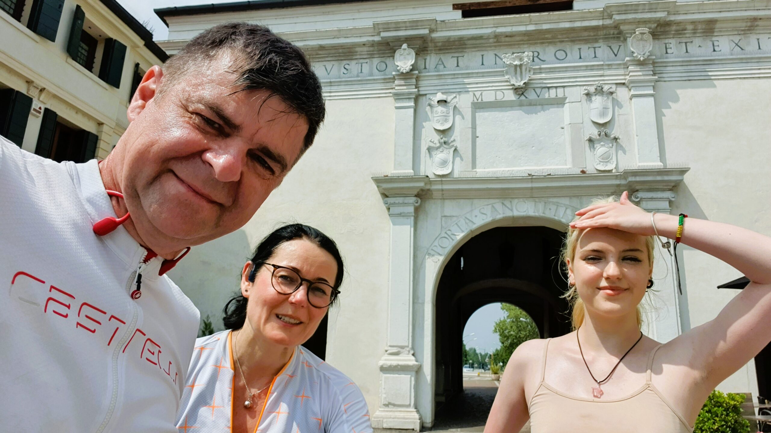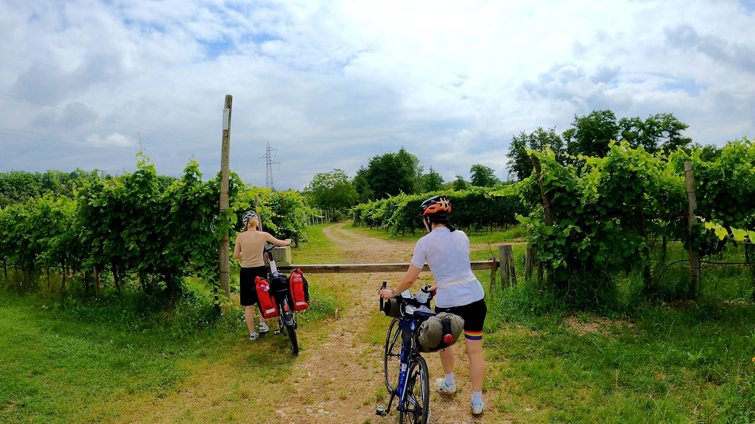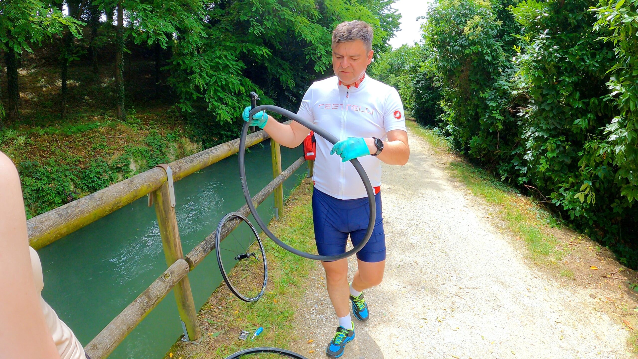 Nasz malowniczy rajd przez winnice Veneto z elementami kolarstwa przełajowego zakończył się defektem i trzeba było dokonać plenerowej wymiany dętki. Na szczęście poszło gładko i po chwili znowu byliśmy w trasie. Wkrótce zauważyliśmy, że otoczenie zaczęło się zmieniać – z górskich krajobrazów przenosiliśmy na płaskie tereny nizinne.