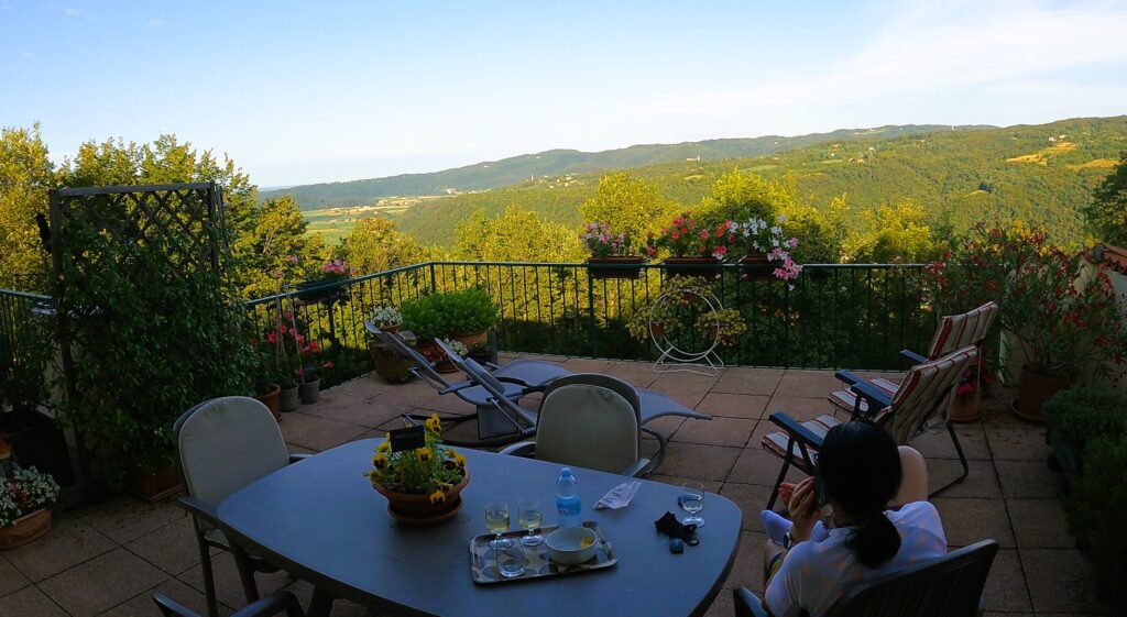 Panorama z przydomowego tarasu na dolinę, skąpaną w popołudniowym słońcu, była jak najlepsze podsumowanie naszego etapu – od deszczowego poranka w Padwie, przez renesansowe serce Wenecji Euganejskiej, aż po złoty zmierzch w Arcugnano.