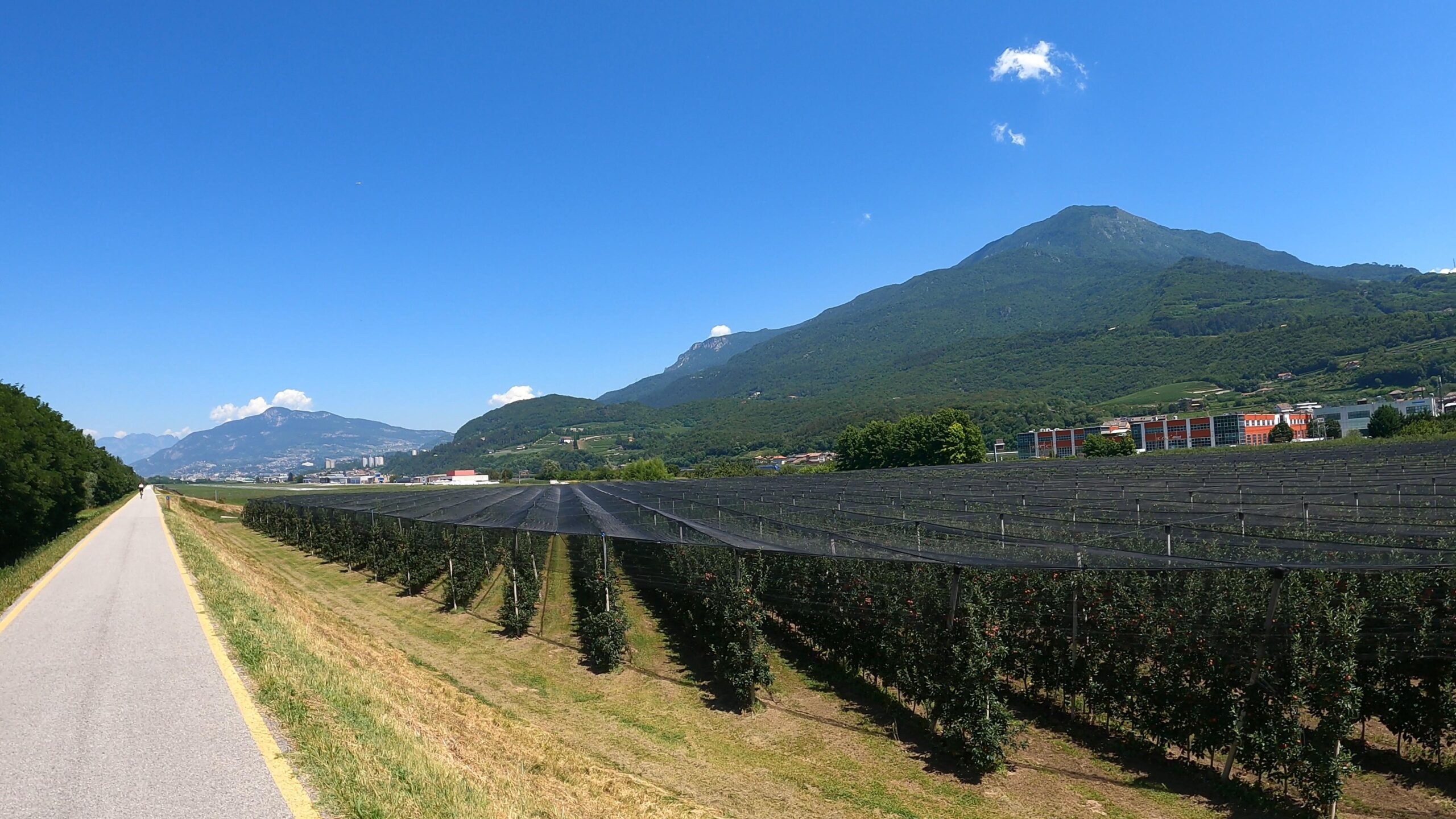 Nasze ostatnie kilometry powoli wyrywały nas z objęć ciepłego klimatu śródziemnomorskiego, by coraz mocniej wpychać w chłodniejsze objęcia alpejskiego krajobrazu. Wspaniałe winnice stopniowo ustępowały miejsca równie imponującym sadom jabłkowym. To właśnie w ich towarzystwie zaczęliśmy odmierzać pozostałe do mety kilometry. Mijając małe lotnisko, coraz wyraźniej odczuwaliśmy, że Trydent jest już na wyciągnięcie ręki.