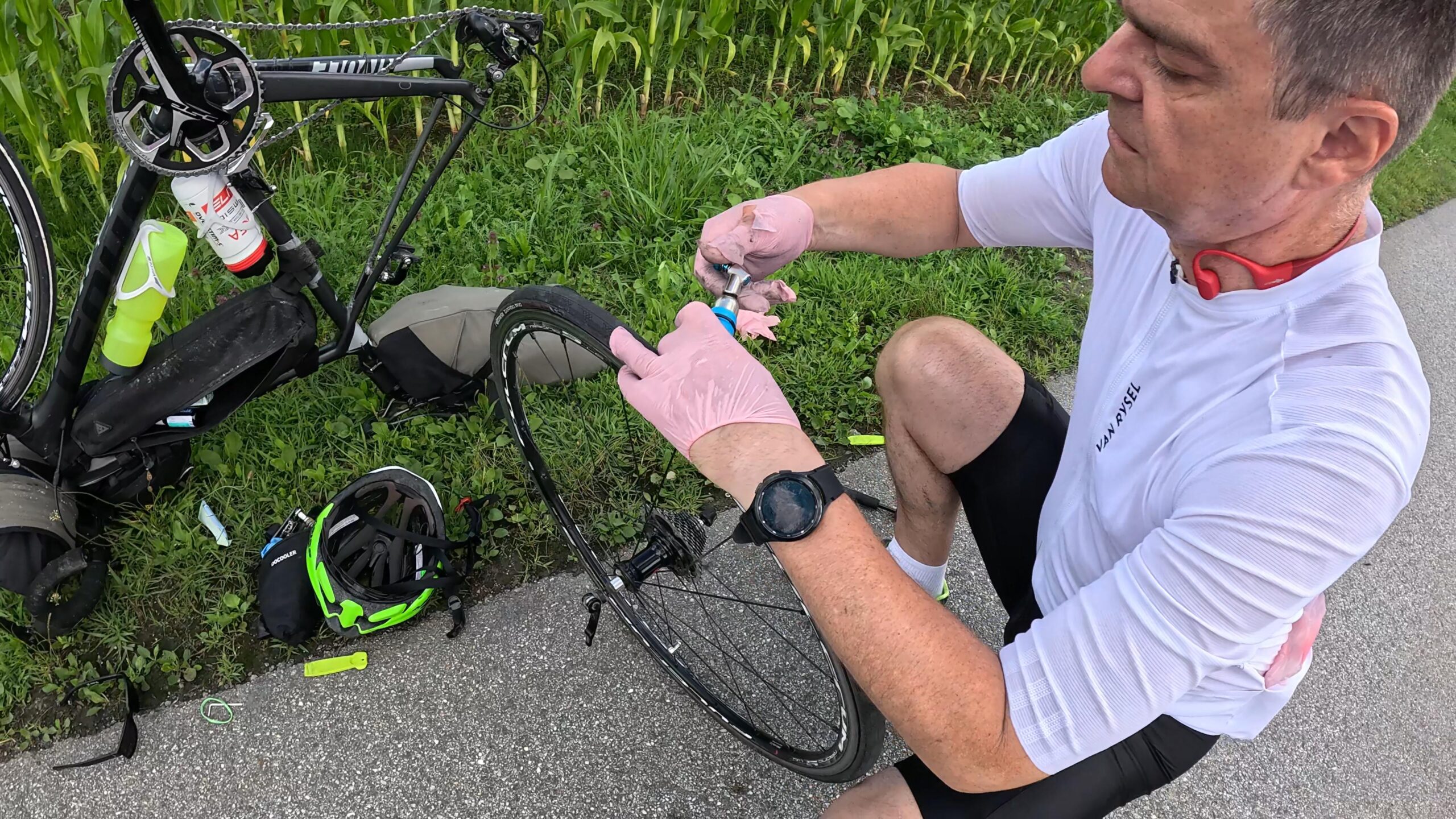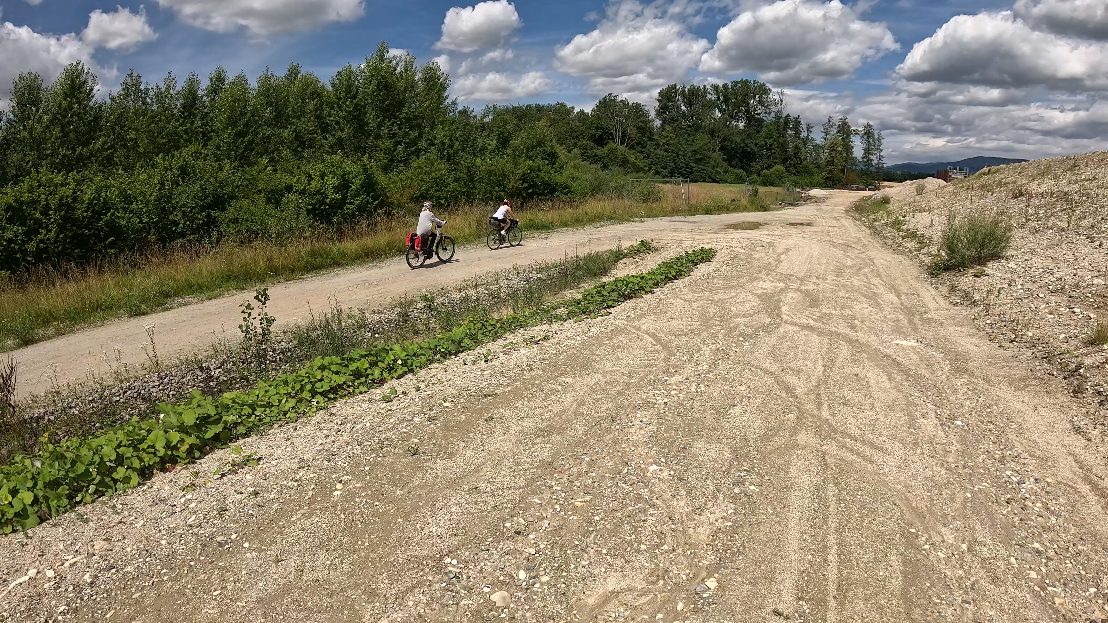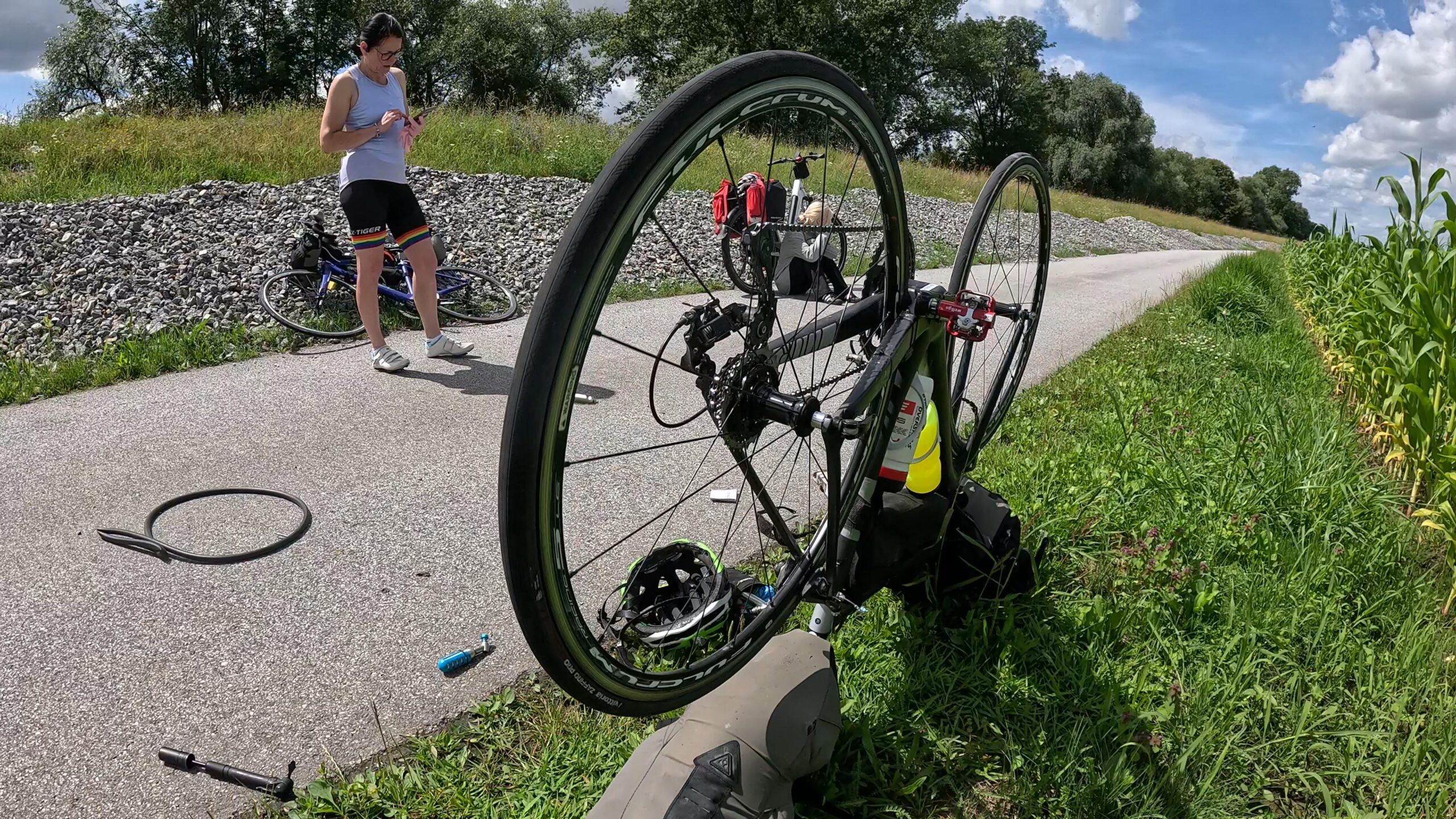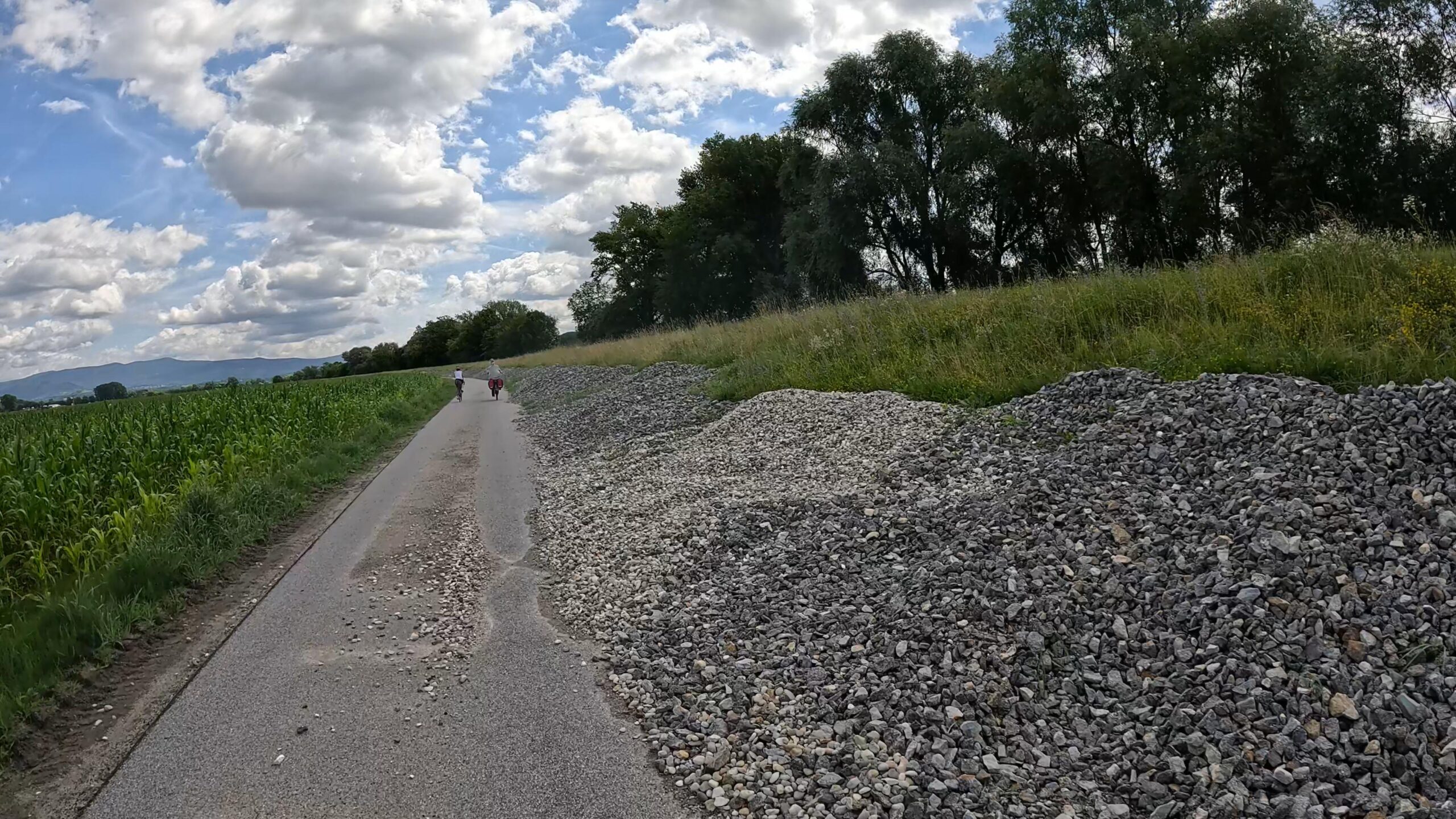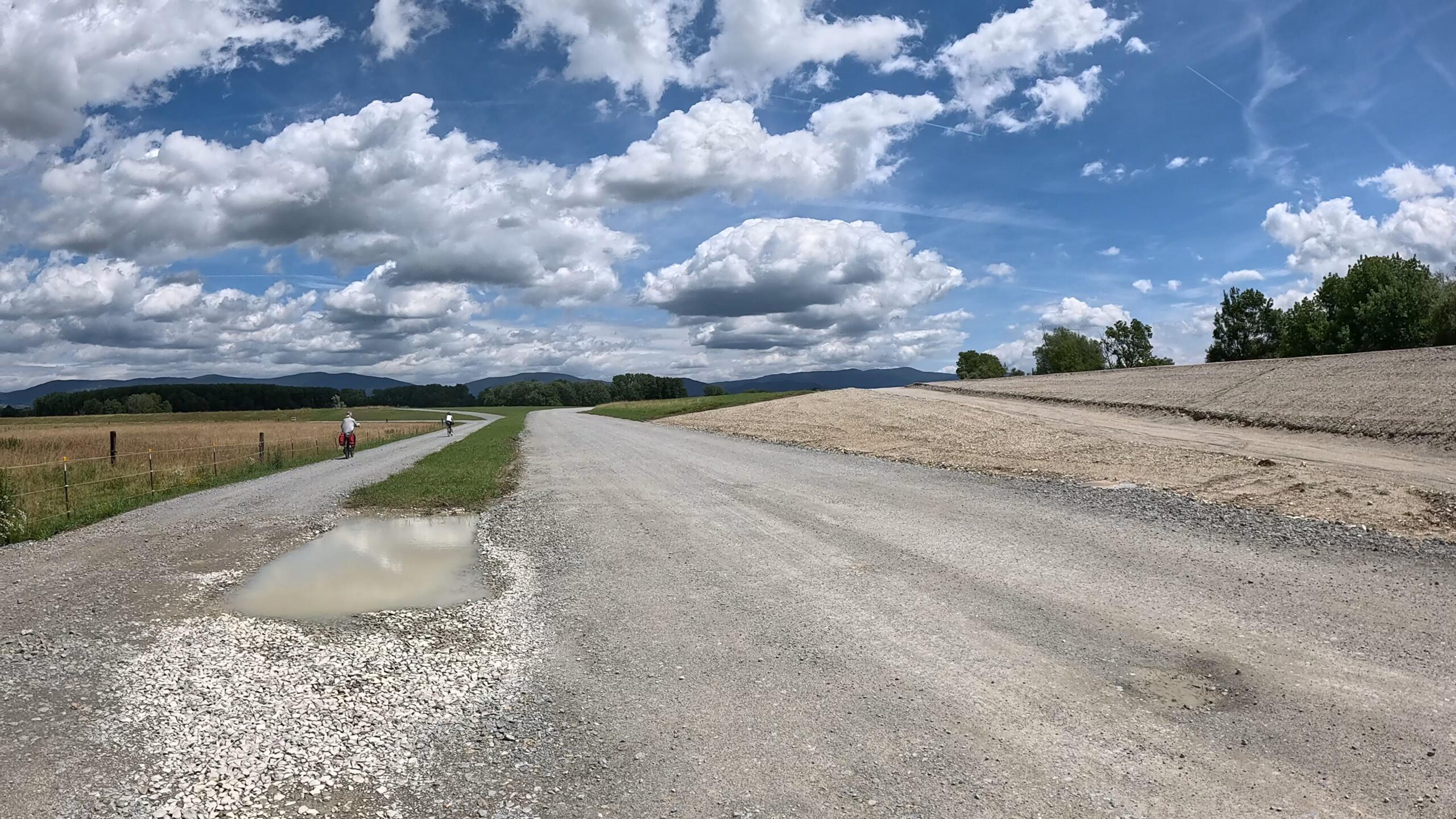 Zaledwie kilkanaście kilometrów za Straubingiem czekała nas pierwsza przeszkoda. Nawierzchnia wypełniona ostrymi kamieniami, używanymi do wzmacniania wałów przeciwpowodziowych, okazała się zdradliwa, a skutek bardziej niż oczywisty – przebita dętka. Wymiana zajęła około 20 minut. To był moment, który przypomniał nam, jak ważne jest odpowiednie wyposażenie. Po naprawie ruszyliśmy w trasę z większą ostrożnością, próbując unikać najbardziej problematycznych fragmentów drogi. Wkrótce okazało się, że to niemożliwe.