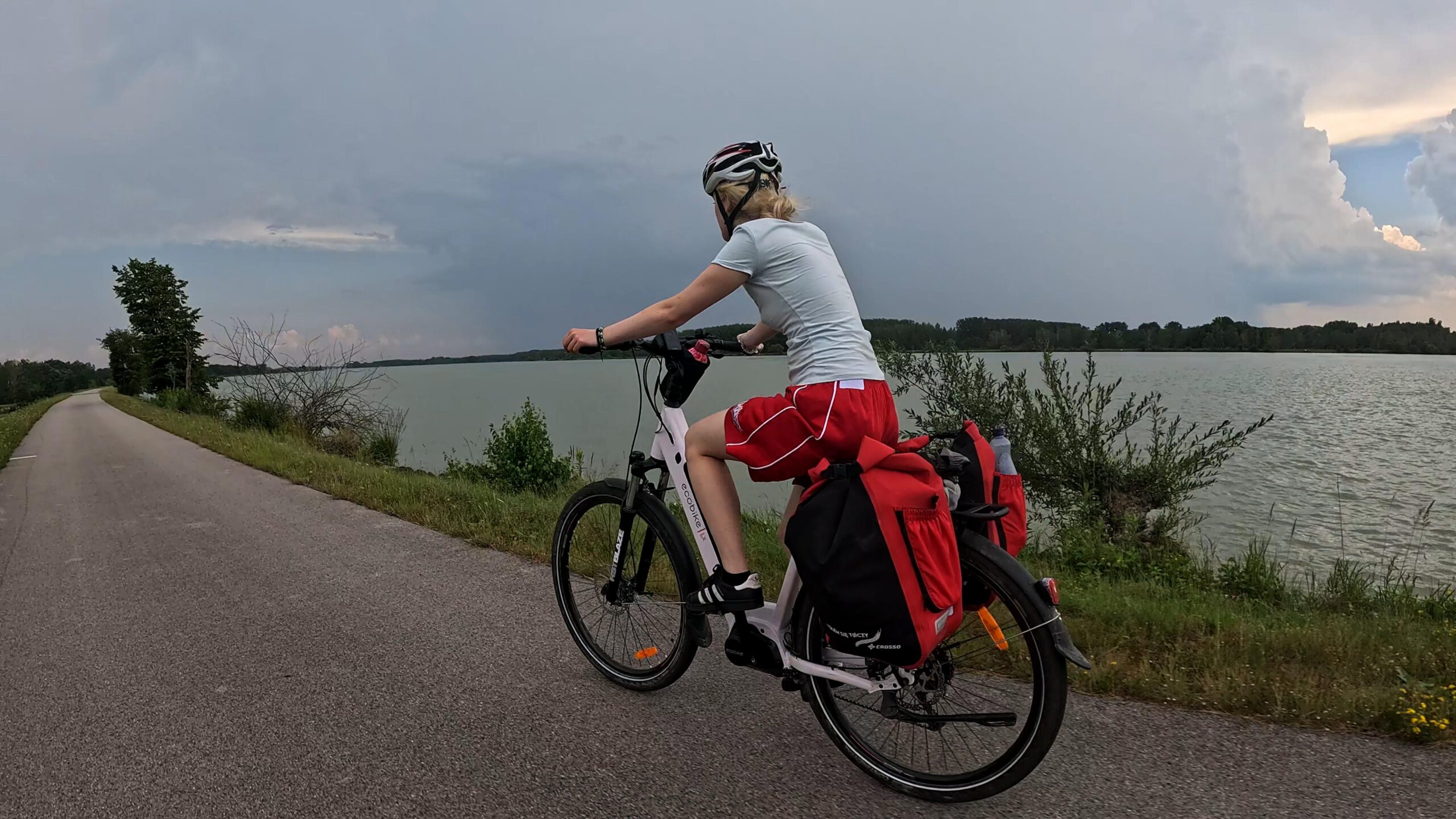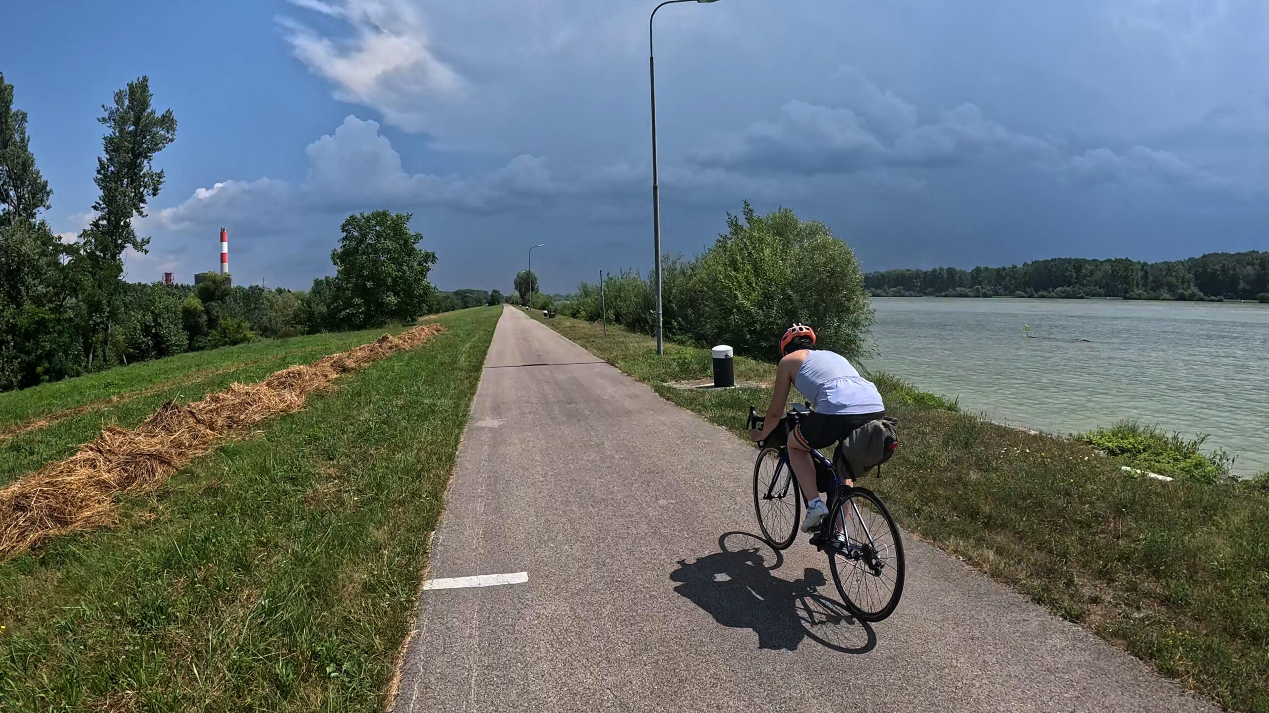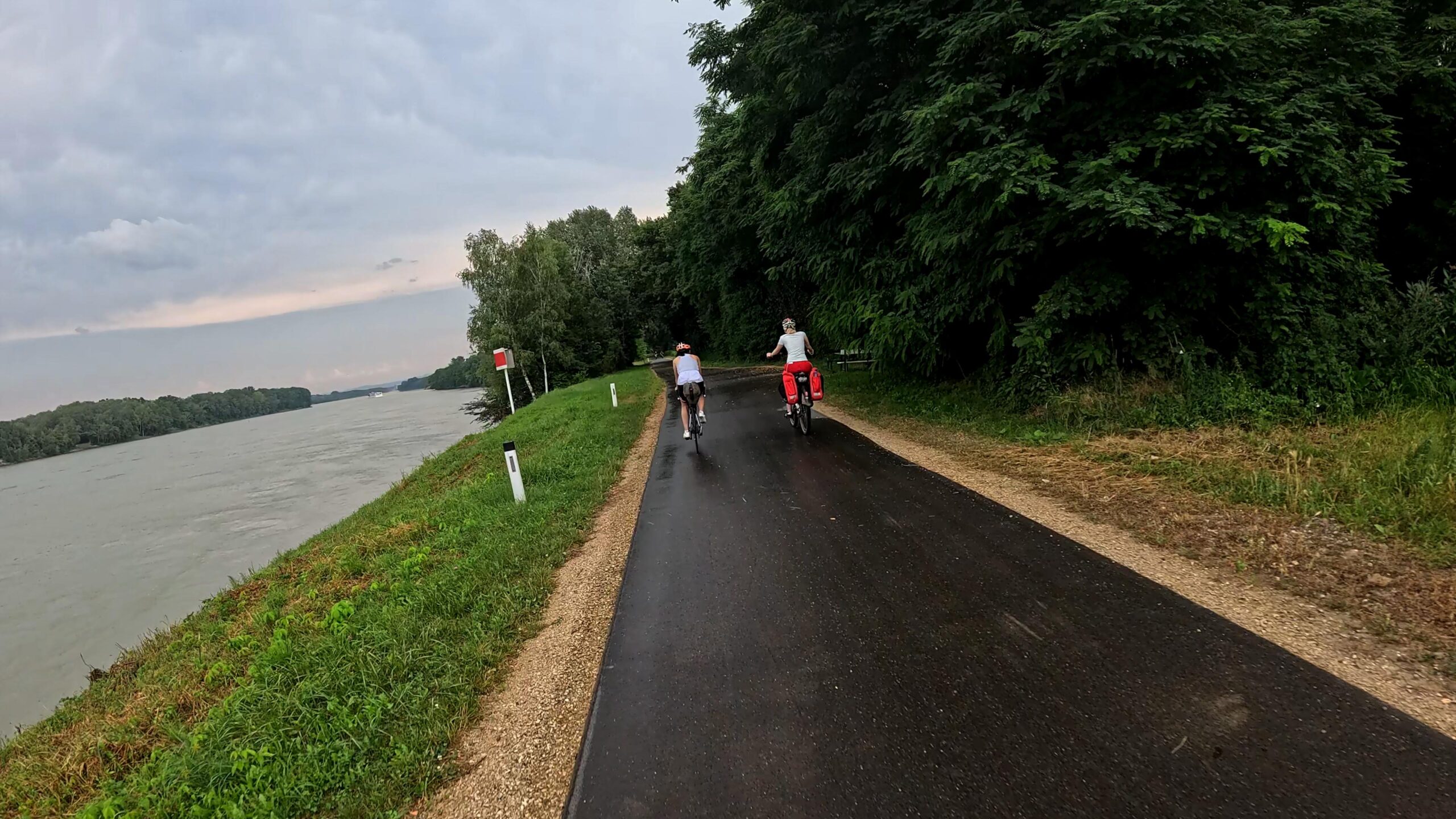 Gdy opuszczaliśmy Krems, na horyzoncie pojawiła się burza. Chmury szybko się zbliżały, a my znaleźliśmy się na otwartym terenie, bez możliwości schronienia. Próbowaliśmy przyspieszyć, ale burza zdawała się gonić nas z każdą minutą. W końcu dotarliśmy do zapory, ale niestety nie znaleźliśmy tam bezpiecznego miejsca. Musieliśmy jechać dalej, mając nadzieję, że uda nam się dotrzeć do najbliższej wioski, zanim burza nas dopadnie.
