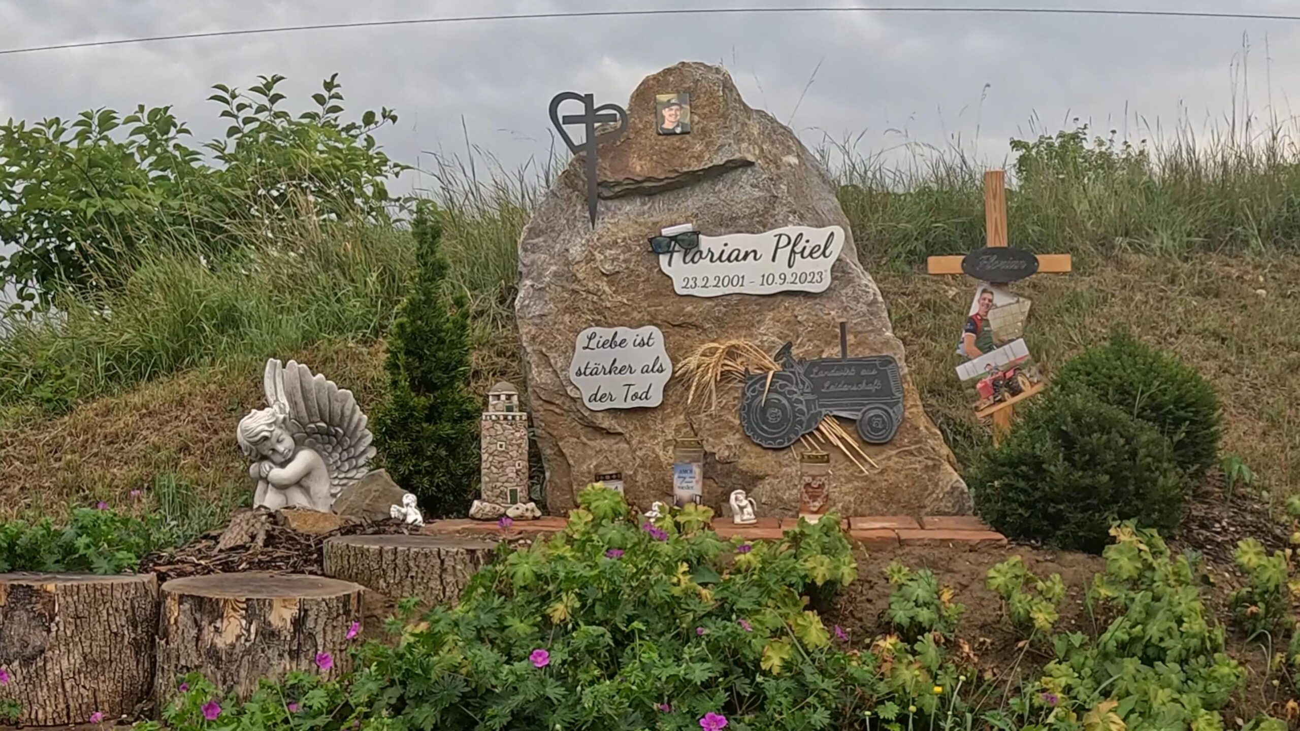 Przed samym Tulln, przy drodze, natknęliśmy się na kamień upamiętniający tragiczny wypadek 22-letniego Floriana Pfiela, młodego piłkarza, który zginął w tym miejscu. Napis na kamieniu głosi: „Miłość jest mocniejsza niż śmierć” – proste, ale poruszające słowa, które przypominają o kruchości życia i pozostawiają refleksję na dłużej.