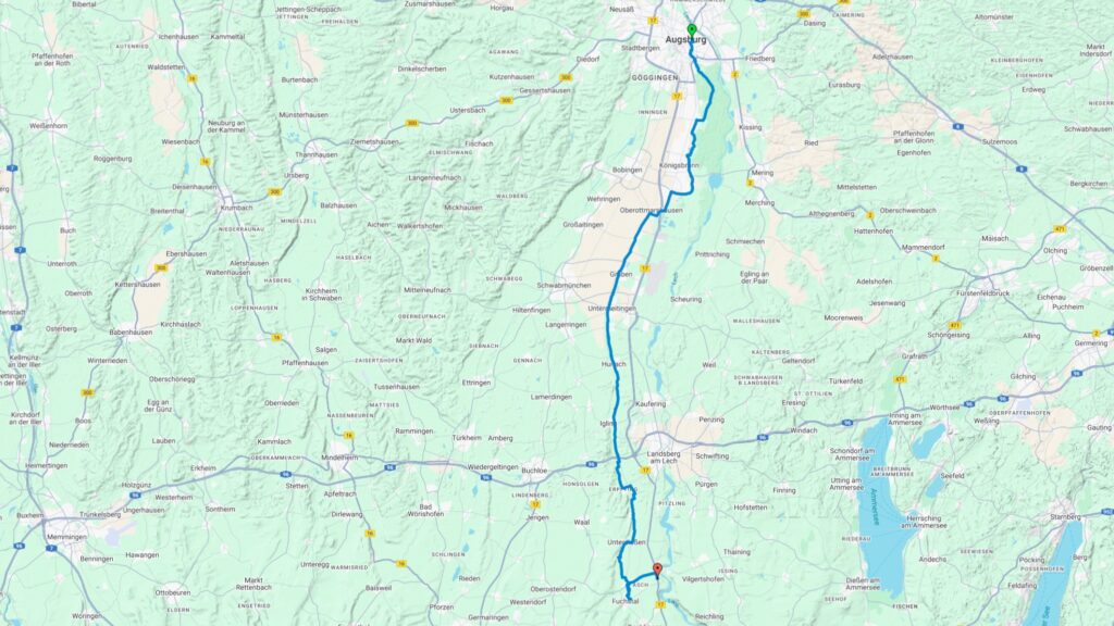 Wyjazd z miasta prowadzi przez rozległy las, który zaczyna się tuż za obrzeżami Augsburga. Droga jest asfaltowa, równa i dobrze utrzymana, dlatego pierwsze kilometry pozwalają spokojnie się rozgrzać i znaleźć własne tempo. W miarę oddalania się od miasta ruch stopniowo cichnie, a krajobraz staje się coraz bardziej otwarty.