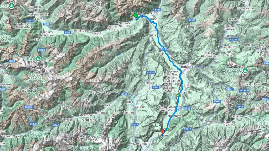 📍 Trasa: Nauders → Reschenpass → Graun / Reschensee → Malles Venosta → Lasa → Rabla