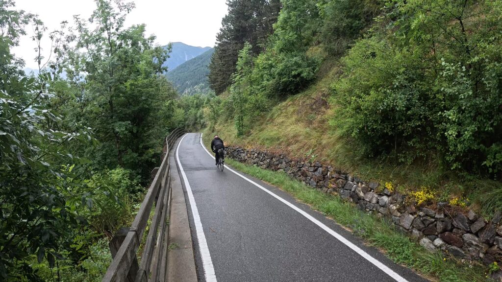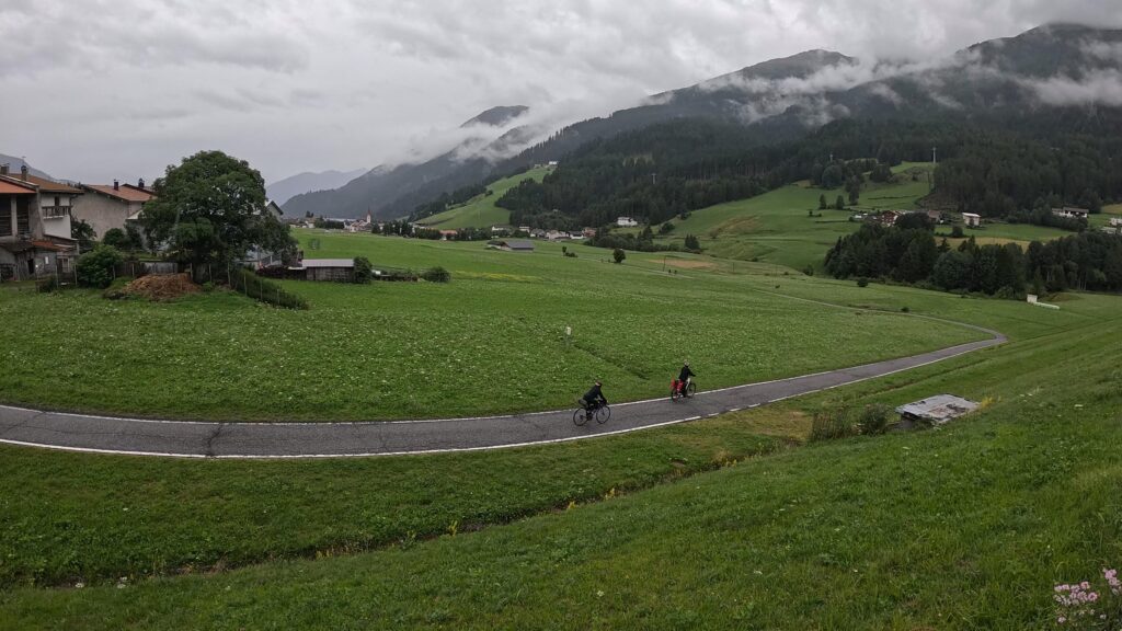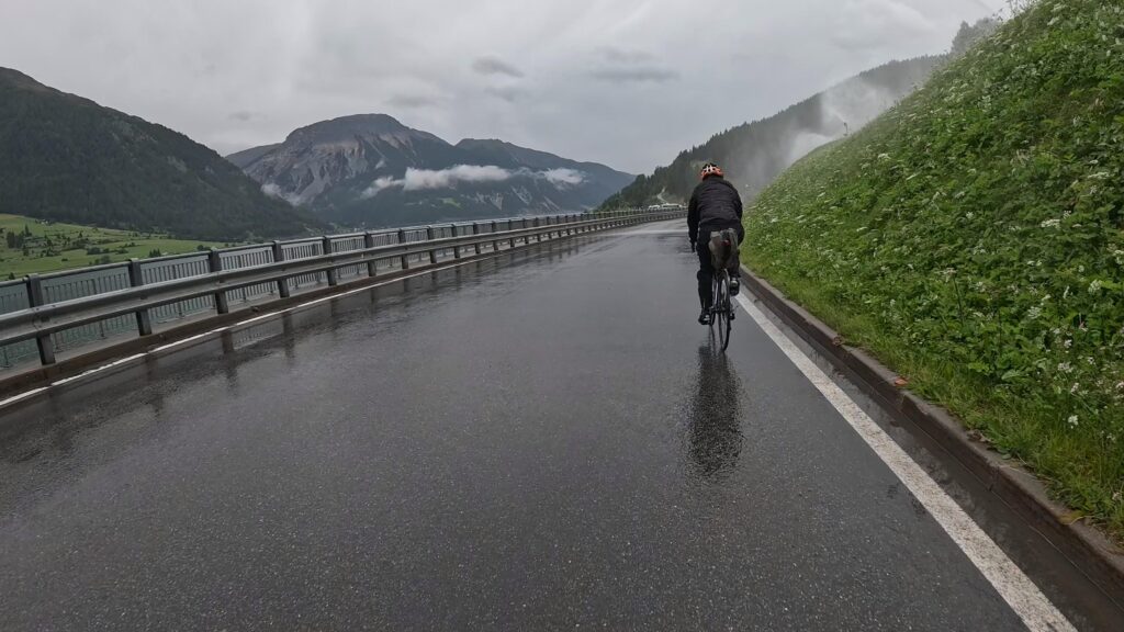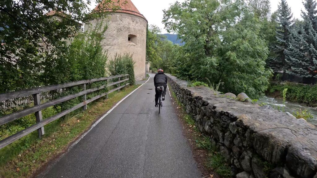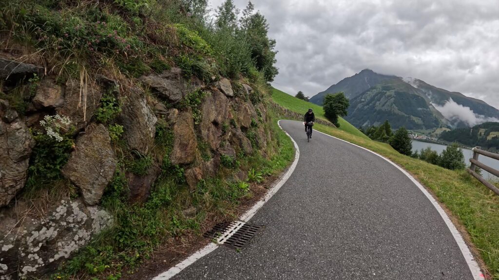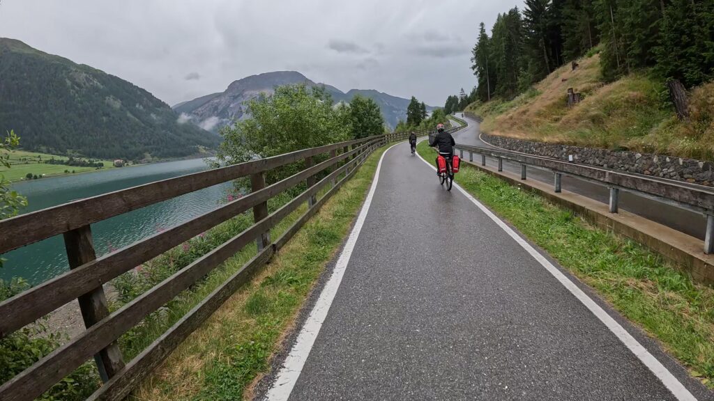 Ruszamy z Nauders, czując jeszcze w nogach trudy poprzedniego dnia. Już po kilku minutach czeka nas krótki, lecz konkretny podjazd na Reschenpass (1507 m n.p.m.), przełęcz oddzielającą Austrię od Włoch. Granica wygląda niepozornie – żadnych bram ani punktów kontrolnych, tylko kilka znaków i asfalt ginący we mgle. W ten sposób, niemal niezauważalnie, przekraczamy granicę i wjeżdżamy do Italii.
