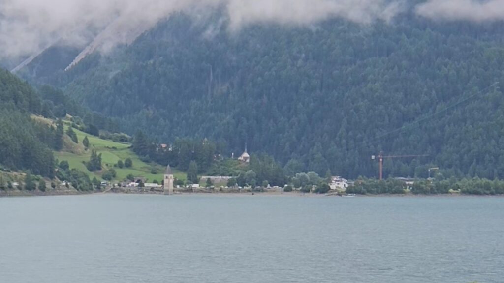 Kilka kilometrów dalej pojawia się widok, którego nie sposób pomylić z żadnym innym. Z tafli jeziora Reschensee wystaje samotna kamienna dzwonnica – pozostałość po wsi Graun, zalanej w latach 50. XX wieku podczas budowy zapory wodnej. Woda pochłonęła wtedy ponad setkę domów i pola uprawne, a mieszkańców przesiedlono do pobliskich miejscowości. Według miejscowej legendy w zimowe noce wciąż słychać dźwięk dzwonu, choć zdjęto go, zanim dolinę wypełniła woda.