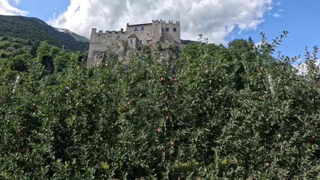 Za zaporą zaczyna się długi zjazd – od źródeł Adygi aż po szeroką dolinę w Południowym Tyrolu. Droga prowadzi w dół, miejscami ostro, więc nawet pojawiają się znaki ograniczające prędkość do 30 km/h. Każdy kilometr przybliża nas do cieplejszego powietrza. Góry wciąż są wokół, surowe i wysokie, niektóre przekraczają 3000 metrów. W dolinie zaczynają się niekończące się sady jabłoni – Południowy Tyrol to przecież największy region sadowniczy Europy. Na dole dojrzewają jabłka, a wyżej, na szczytach, wciąż leży śnieg. Ten kontrast między zimowym chłodem a letnim ciepłem jest jednym z najbardziej charakterystycznych obrazów tej drogi.