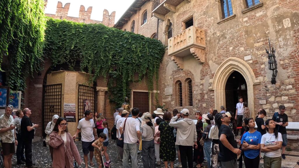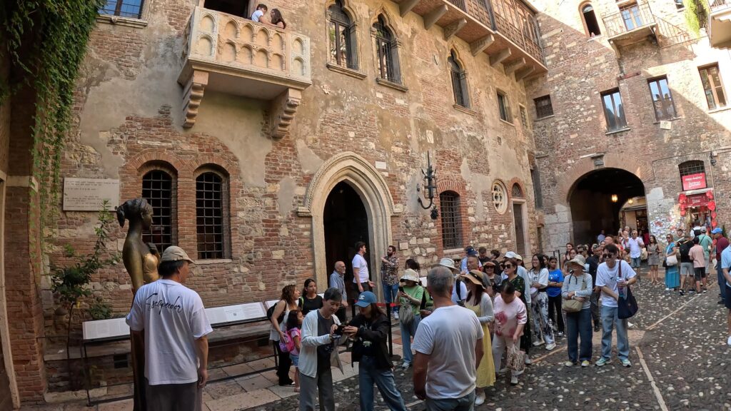 Poranek zaczynamy w jednym z najbardziej rozpoznawalnych miejsc Werony – pod słynnym balkonem Julii. Tłum turystów, szmer rozmów, setki telefonów w górze. Miejsce to symbol romantyzmu, choć w rzeczywistości ma więcej wspólnego z legendą niż z historią. Dom Julii został urządzony dopiero w XX wieku, a sam balkon dodano, aby odpowiedzieć na oczekiwania przyjezdnych. Mimo to trudno pominąć je podczas wizyty w mieście, bo to właśnie tu tworzy się magię literackiego miejsca.