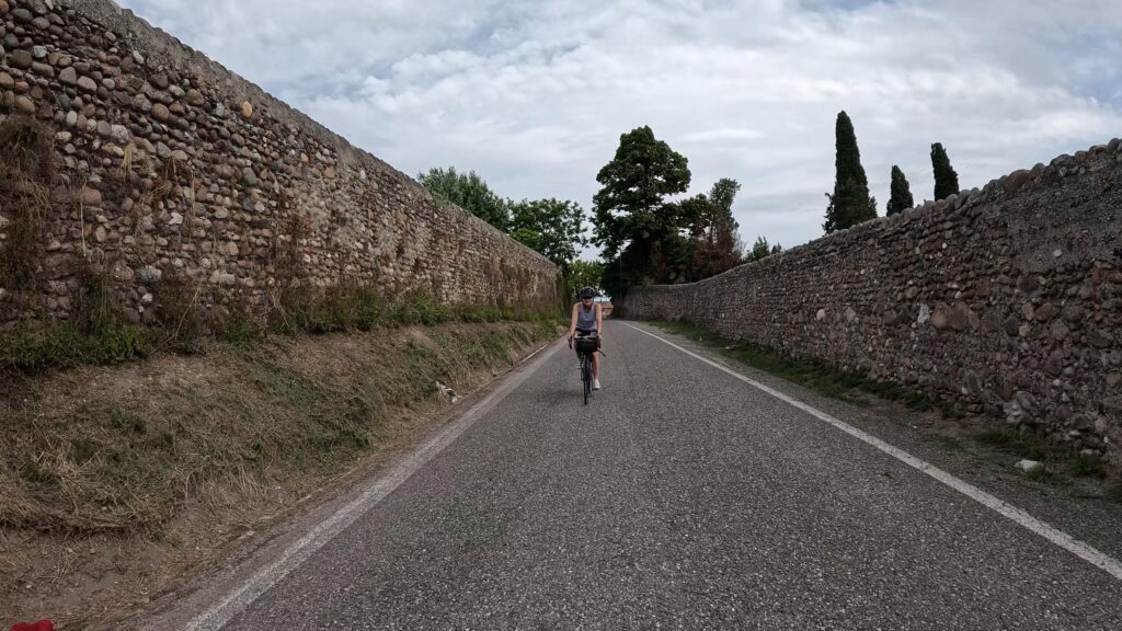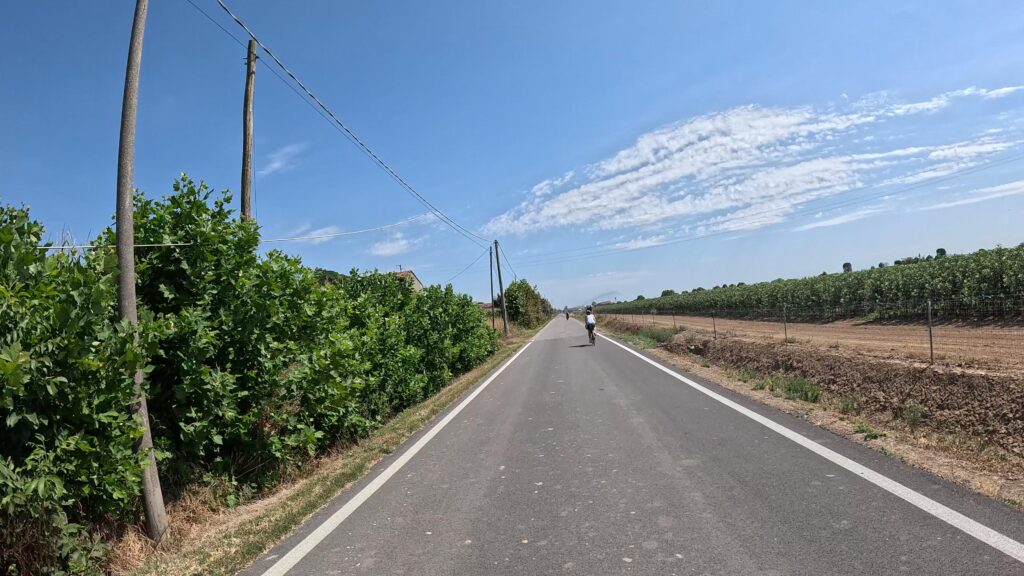 Po powrocie na główną trasę łatwo zauważyć, że starożytni Rzymianie kochali geometrię. Droga ciągnie się niemal idealnie prosto, bez zakrętów i wzniesień. Z jednej strony ułatwiało to kiedyś marsz legionów, z drugiej dla rowerzysty oznacza monotonię i nieustanny żar z nieba. Na szczęście zapach bazylii z pobliskich pól wynagradza wszystko – jest tak intensywny, że ma się wrażenie, iż powietrze smakuje włoską kuchnią.